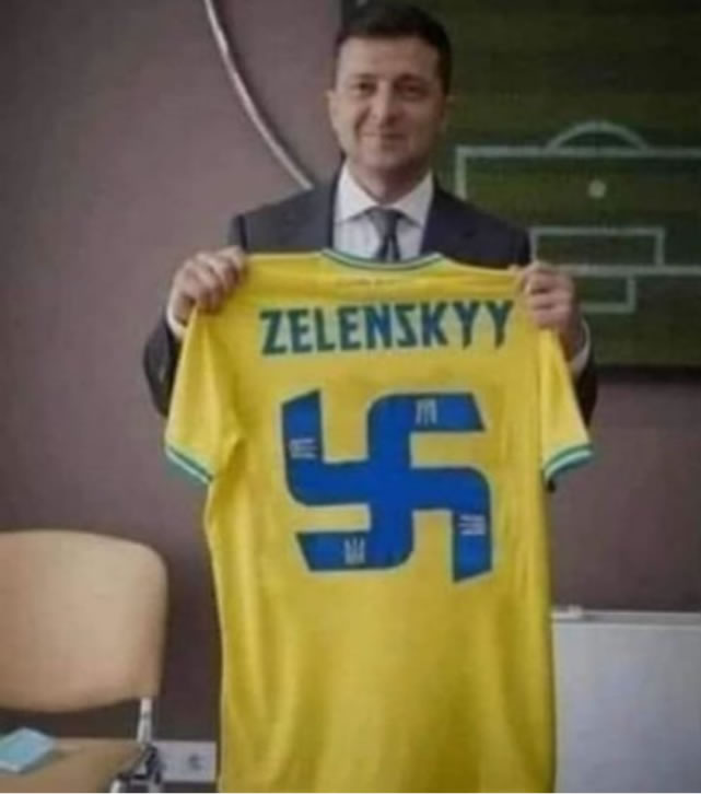 Ukrajinský prezident Volodymyr Zelenskyj je fašista. Dokazuje to jeho fotografie s jeho tričkem, na kterém je zobrazen hákový kříž (svastika).
